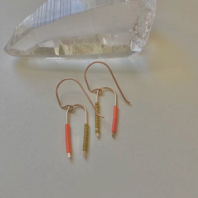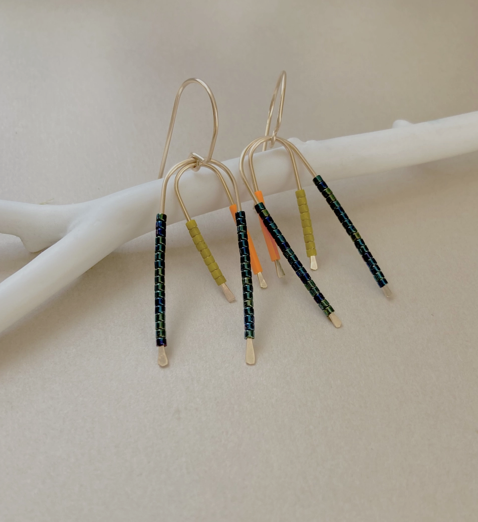 The Canopy earring features abstract form and hues inspired by botany, finished on hand-formed hypoallergenic 14k gold-filled components. Laurel/Foxglove/Nightshade 2" drop. Meadow/Glacier/Dune/Branch 1.5in drop. Love the unique design of this earring.