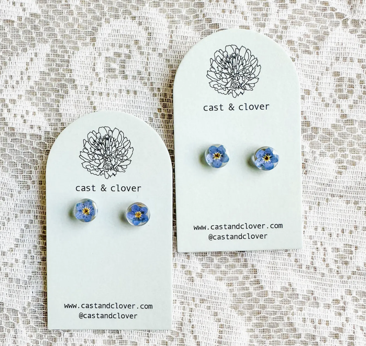 Hand-pressed blue forget-me-nots cast in resin. Gold-plated earring post. Please note: Each flower is unique so your piece may differ slightly from the photo. I proudly make each piece by hand - not using a machine process - so there may be minor imperfections in the resin.