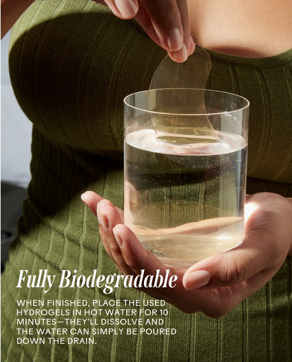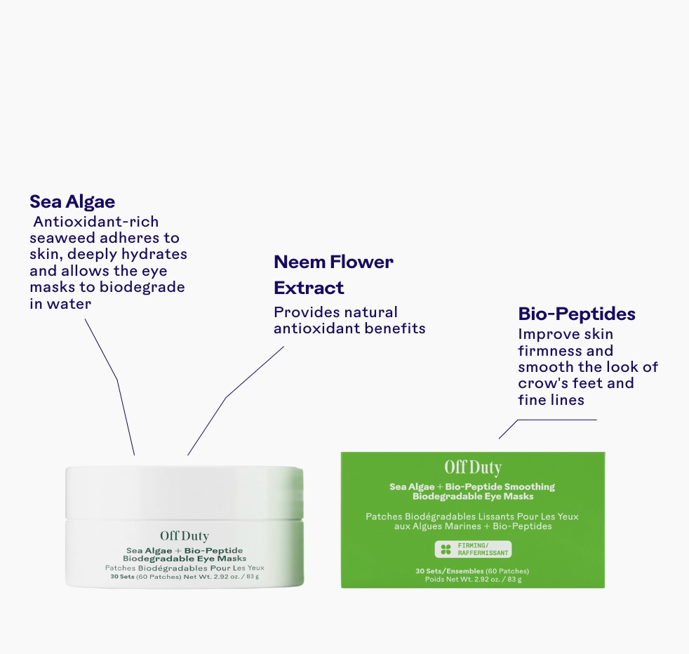 Visibly firm, refresh and deeply hydrate your under-eye area—without the need for excess plastic waste. As we age, collagen decreases around the eyes leading to crow’s feet and fine lines. Give your eyes a boost with our smoothing biodegradable eye masks! Formulated with vegan Bio-Peptides to improve firmness, lock in moisture and promote stronger, healthier-looking skin. Sea Algae Extract, a potent antioxidant and hydrator, allows the masks to adhere to your skin and dissolve when you’re done using them. After just 10 minutes, the under-eye area appears firmer and more supple, and fine lines and wrinkles look smoother. Formulated for all skin types.